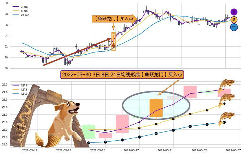 ⚀ 2022-05-30日显现 3日-8日-21日均线 【鱼跃龙门】买入点 看多信号,后市看涨,买入