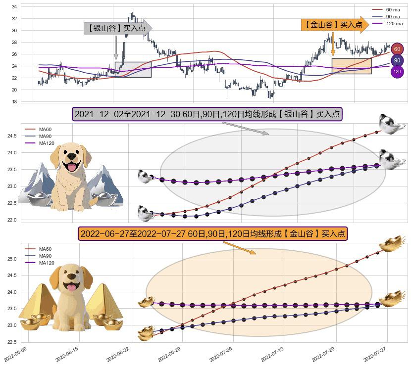 ⚃ 2022-06-28-日至2022-07-27-日显现 60日-90日-120日均线 【金山谷】买入点 其再次确认了买入信号,可靠性更强,买入