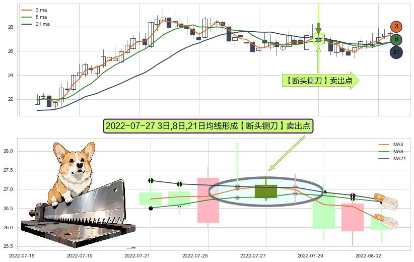 ⚀ 2022-07-27日显现 3日-8日-21日均线 【断头铡刀】卖出点 看空信号,后市看跌,卖出