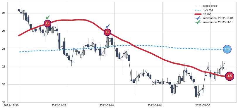 ⚂ 2022-05-30日开盘向上跳空高开+0.35%, 向上脱离整理形态,且收盘突破均线组合