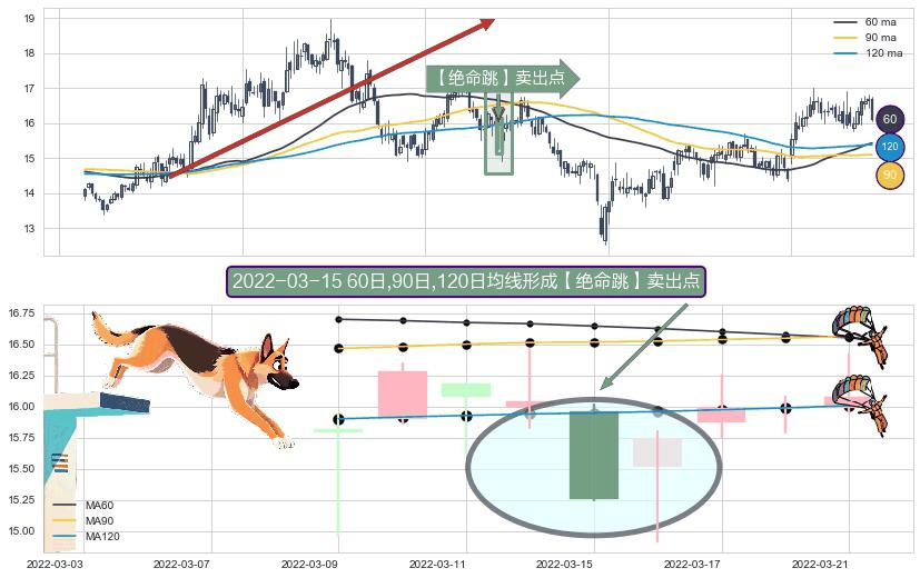 形态多维评估: ⚀ 2022-03-15日显现 60日-90日-120日均线 【绝命跳】卖出点 看空信号,后市看跌,卖出