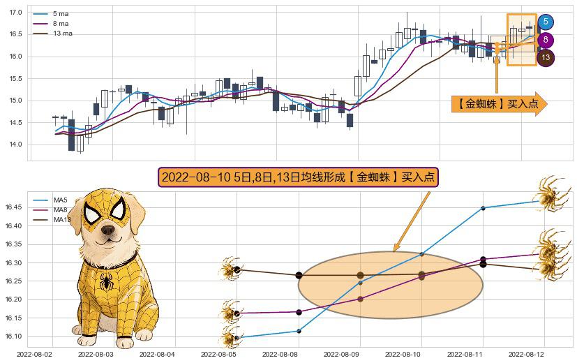 形态多维评估: ⚀ 2022-08-10日显现 5日-8日-13日均线 【金蜘蛛】买入点 看多信号,后市看涨,买入