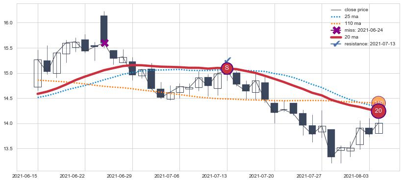 下跌趋势2021-06-15-2021-08-04,均线20确认关键阻力1处