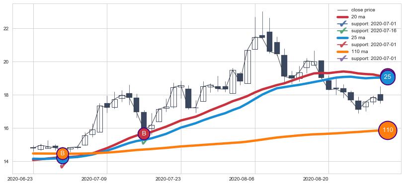上涨趋势2020-06-23-2020-08-31,均线25, 20, 110确认关键支撑2处