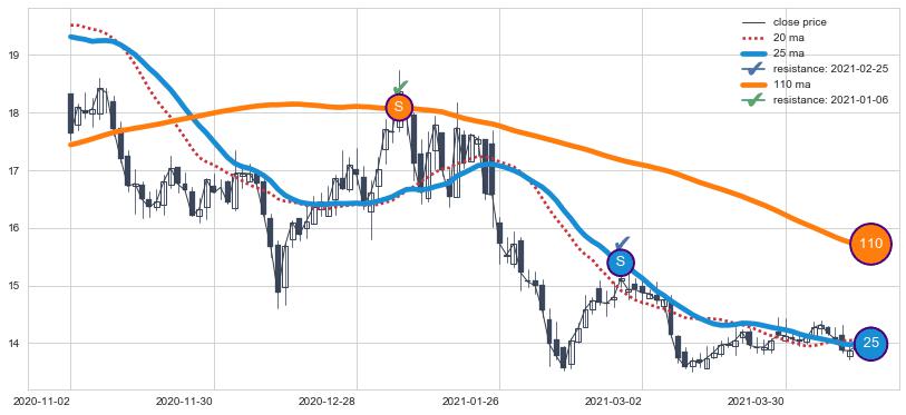 下跌趋势2020-11-02-2021-04-14,均线25, 110确认关键阻力2处