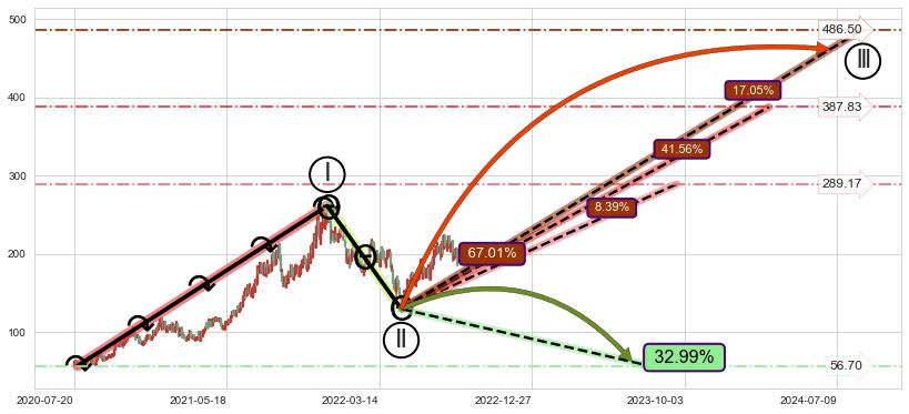 ➣ D点拟合预测价格92.07,距离最后交易收盘价格189.58相差 -51.43%
