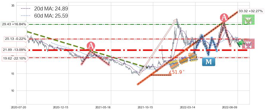 ♘ 支撑价格位25.13,可信任强度45.55%,距离最后交易2022-08-12形成的收盘价格25.19相差 -0.22%