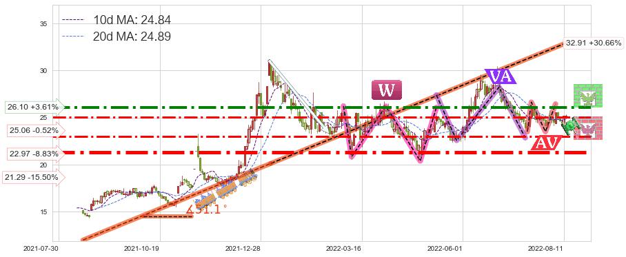 ♘ 阻力价格位26.10,可信任强度77.06%,距离最后交易2022-08-12形成的收盘价格25.19相差 +3.61%