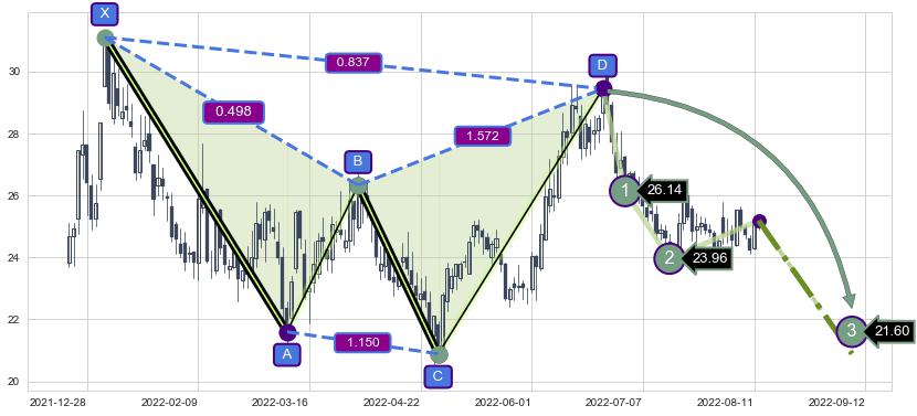 ➣ 未完成【伽利】形态起点X: 2021-10-27, 已到达C点: 2022-06-24, 预测最终D点: 2023-01-17, 共288交易日