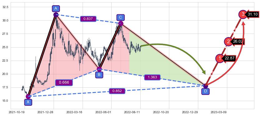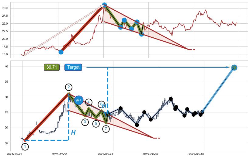 ➣ AI预测: 假定反转启动后, 第❶目标位置(2023-02-21, 22.87)
