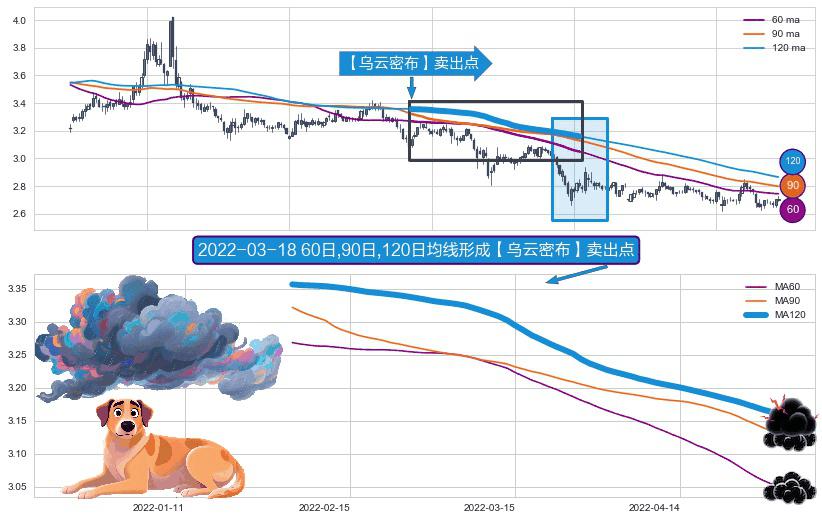 ⚀ 2022-01-28日-2022-05-05日显现 60日-90日-120日均线 【乌云密布】卖出点 看空信号,后市看跌,卖出