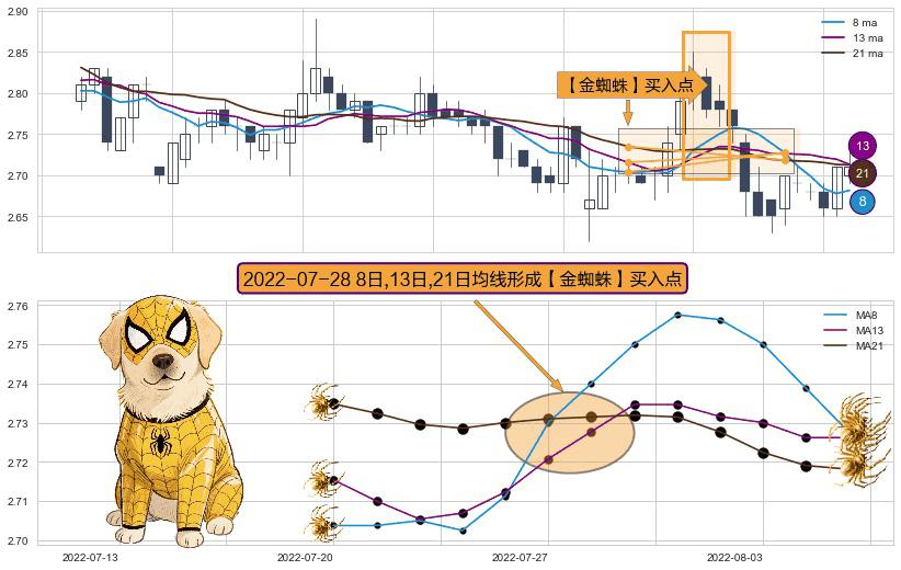 ⚀ 2022-07-28日显现 8日-13日-21日均线 【金蜘蛛】买入点 看多信号,后市看涨,买入