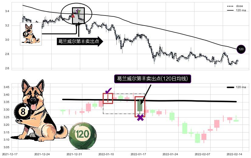 ⚀ 2022-01-14-日显现 葛兰威尔均线 120日均线 第⑧卖出点 下降趋势的中继信号,后市看跌,卖出信号