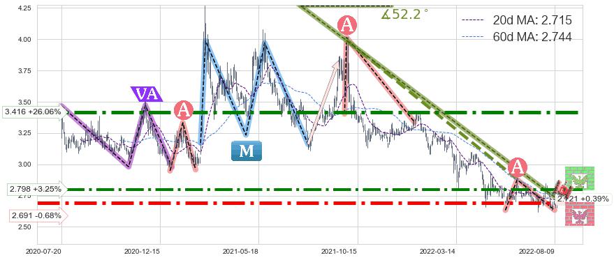 🦴 长线均值回复组合短线趋势跟踪[强阻力信号]2021-02-24-2022-08-12下跌趋势依然成立(下跌趋势跟踪依然存在),短线价格略微上行反弹(均值回复猜想),即将接近下跌趋势提供的未破位阻力价格:2.721。