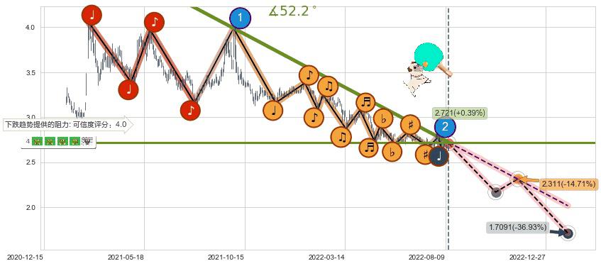 ♘ 在最后的下跌阶段2021-02-24至2022-08-12,存在 持续未破位的阻力位 ,阻力价格2.721,可信任强度82.07%,其距离最后价格2.710相差 +0.39%