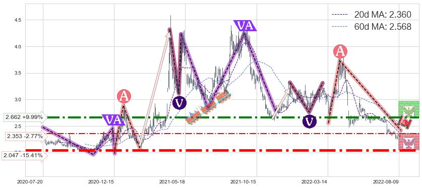 ♘ 支撑价格位2.047,可信任强度95.22%,距离最后交易2022-08-12形成的收盘价格2.420相差 -15.41%