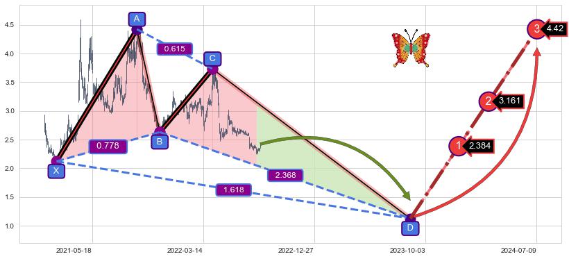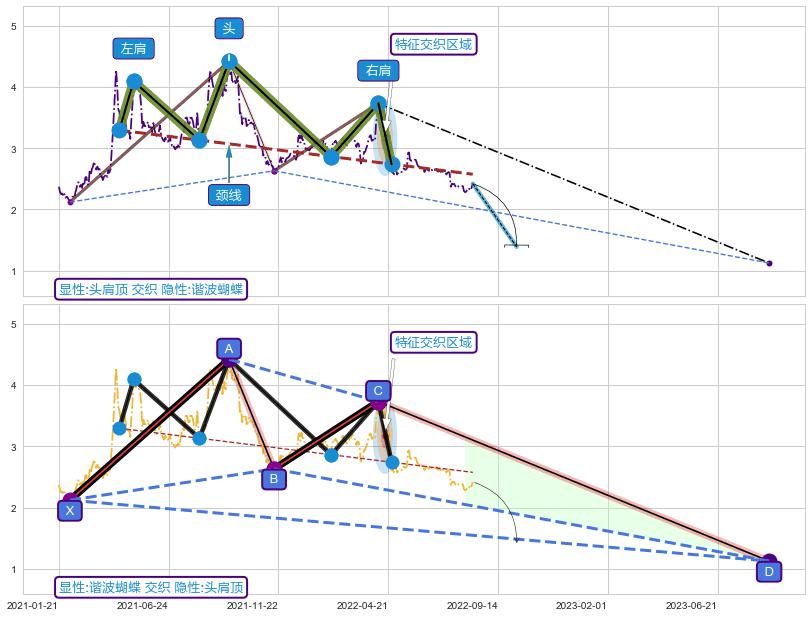 ➣ 未完成【蝴蝶】形态起点X: 2021-02-04, 已到达C点: 2022-04-08, 预测最终D点: 2023-08-25, 共631交易日