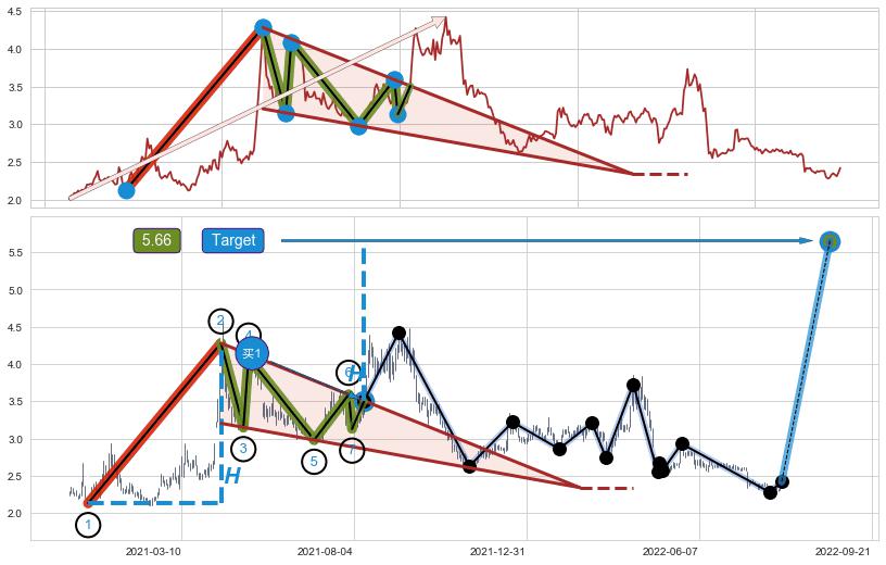 ➢ 【买1】: 激进型 买点 →(2021-08-12: 3.506 )形成突破降🚩楔型【整理】形态