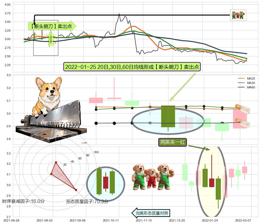 | 3 🅚:【绝命跳】卖出点 ➕ 📐:头肩顶下行突破支撑位破位, 猜想持续下沉下跌,被突破的支撑位已变为阻力位 ☞ 看空信号 ⇥ 【均线】交织【图形】⇥ 综合量化分数: 35 | > |