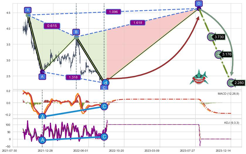 ➣ 未完成【鲨鱼】形态起点X: 2021-09-09, 已到达C点: 2022-08-03, 预测最终D点: 2023-08-10, 共482交易日