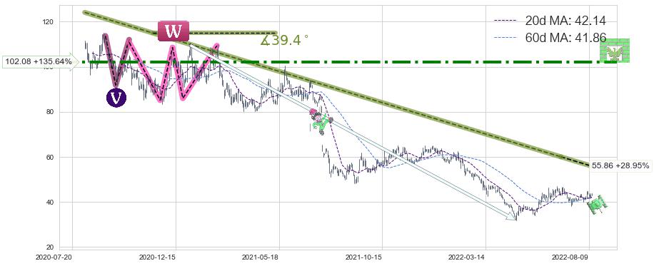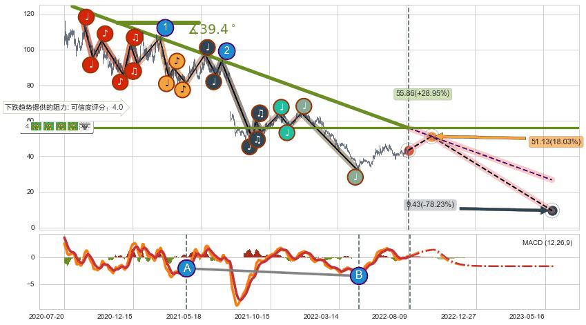 ♘ 在最后的下跌阶段2020-08-05至2022-07-01,存在 持续未破位的阻力位 ,阻力价格55.86,可信任强度86.11%,其距离最后价格43.32相差 +28.95%
