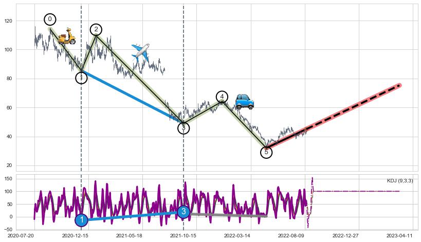 ➣ 第一, 三驱动浪端点:【KDJ】走势出现【常规背离 & 反转信号】背离程度34.35%,背离夹角角度61.2˚,背离程度较小