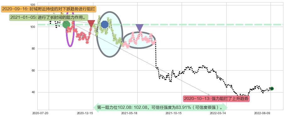 ♘ 阻力价格位102.08,可信任强度83.91%,距离最后交易2022-08-12形成的收盘价格43.32相差 +135.64%