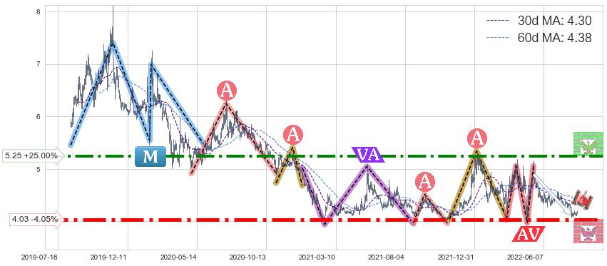 ♘ 支撑价格位4.03,可信任强度89.04%,距离最后交易2022-08-12形成的收盘价格4.20相差 -4.05%