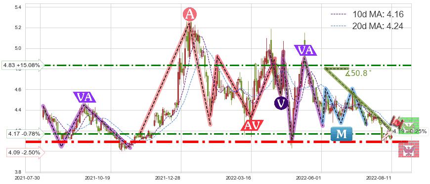 ♘ 阻力价格位4.17,可信任强度56.96%,距离最后交易2022-08-12形成的收盘价格4.20相差 -0.78%