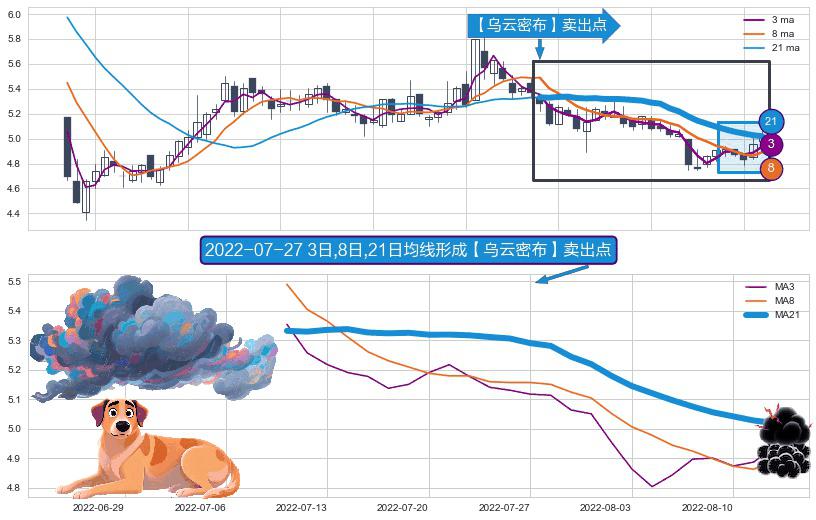 ⚀ 2022-07-11日-2022-08-12日显现 3日-8日-21日均线 【乌云密布】卖出点 看空信号,后市看跌,卖出