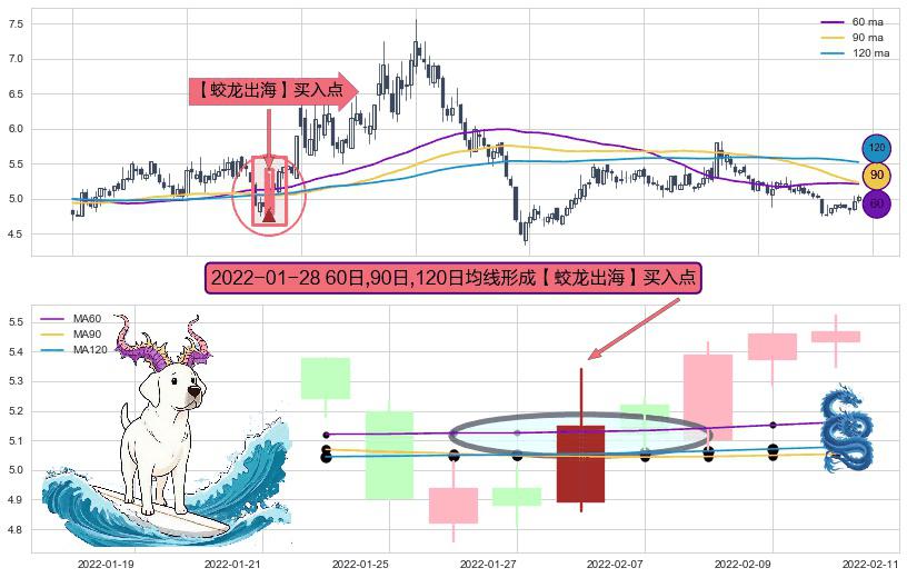 ⚀ 2022-01-28日显现 60日-90日-120日均线 【蛟龙出海】买入点 看多信号,后市看涨,买入
