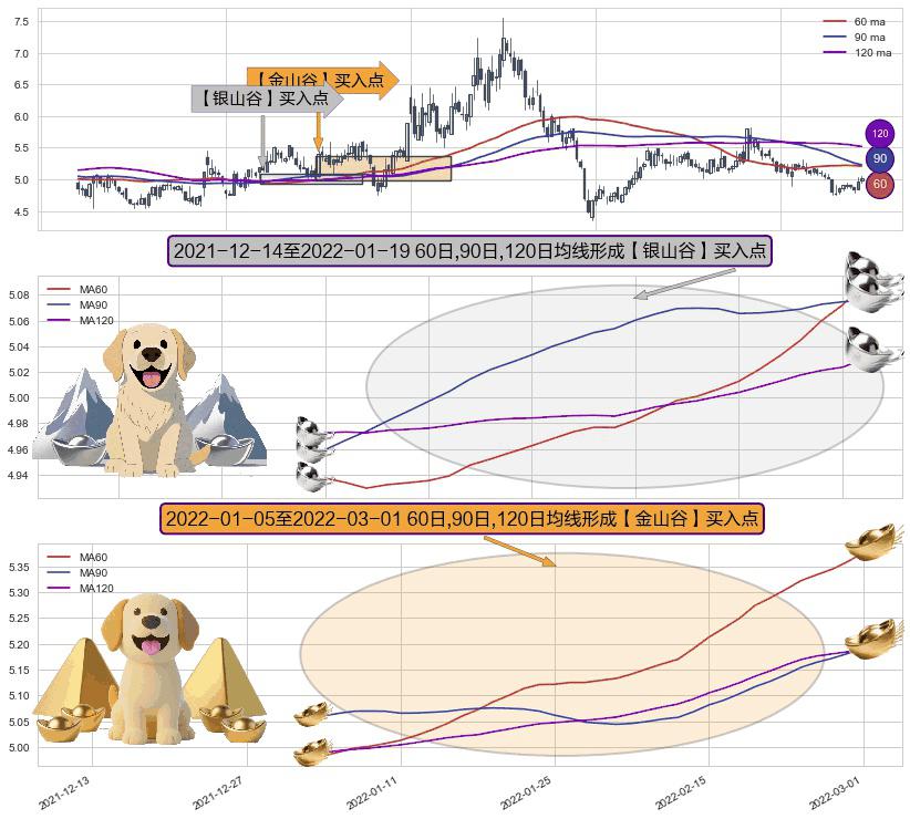 ⚀ 2022-01-06-日至2022-03-01-日显现 60日-90日-120日均线 【金山谷】买入点 其再次确认了买入信号,可靠性更强,买入