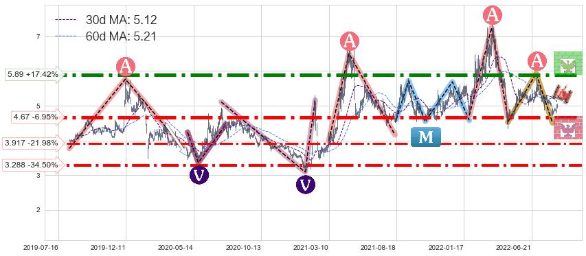 ♘ 阻力价格位5.89,可信任强度94.53%,距离最后交易2022-08-12形成的收盘价格5.02相差 +17.42%