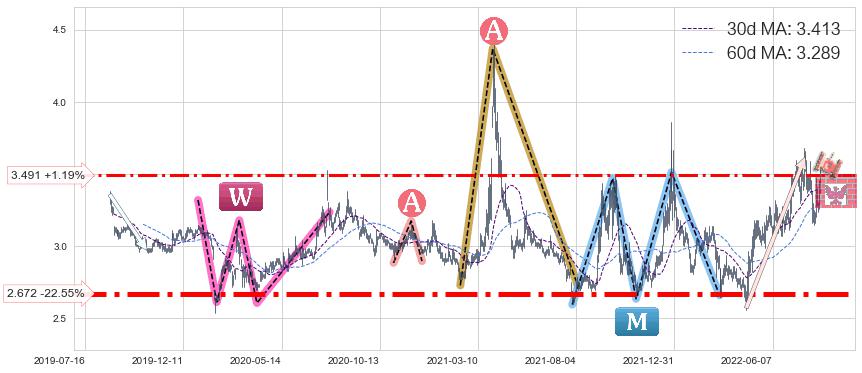 ♘ 支撑价格位3.491,可信任强度65.30%,距离最后交易2022-08-12形成的收盘价格3.450相差 +1.19%