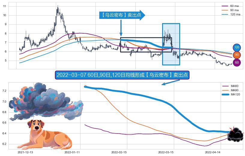 ⚀ 2022-01-13日-2022-04-21日显现 60日-90日-120日均线 【乌云密布】卖出点 看空信号,后市看跌,卖出