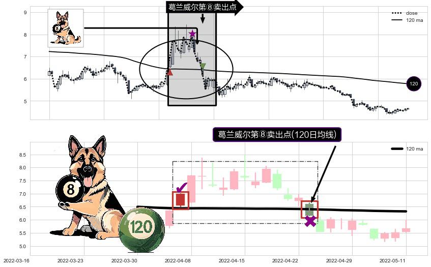 ⚀ 2022-04-25-日显现 葛兰威尔均线 120日均线 第⑧卖出点 下降趋势的中继信号,后市看跌,卖出信号