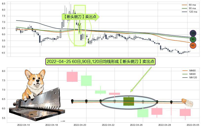 ⚀ 2022-04-25日显现 60日-90日-120日均线 【断头铡刀】卖出点 看空信号,后市看跌,卖出