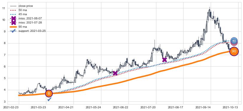 ⚁ MA60和MA90走势平行,且始终保持在短距离内,MA120始终在短中期均线上方,与短中期均线保持一定的距离,微微下行