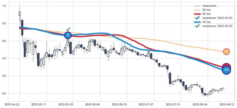 ⚂ 2022-04-07-日均线向上突破,2022-04-25-日重新下穿均线破位,均线阻力再次生效