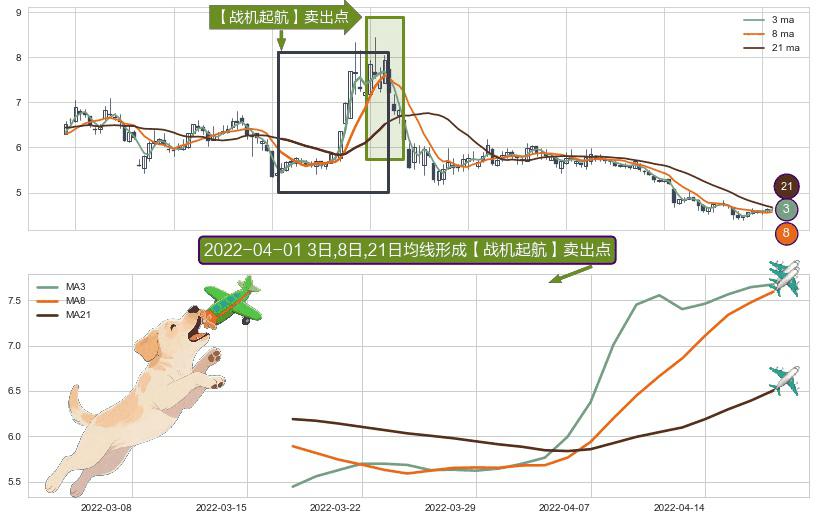 ⚀ 2022-03-17日-2022-04-19日显现 3日-8日-21日均线 【战机起航】卖出点 看空信号,后市看跌,卖出