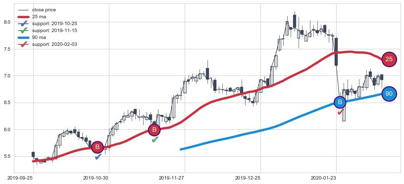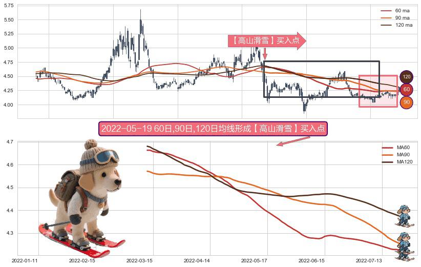 ⚀ 2022-03-11日-2022-07-21日显现 60日-90日-120日均线 【高山滑雪】买入点 看多信号,后市看涨,买入