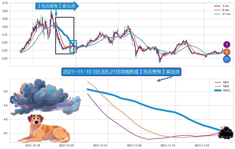 ⚀ 2021-10-27日-2021-11-24日显现 3日-8日-21日均线 【乌云密布】卖出点 看空信号,后市看跌,卖出