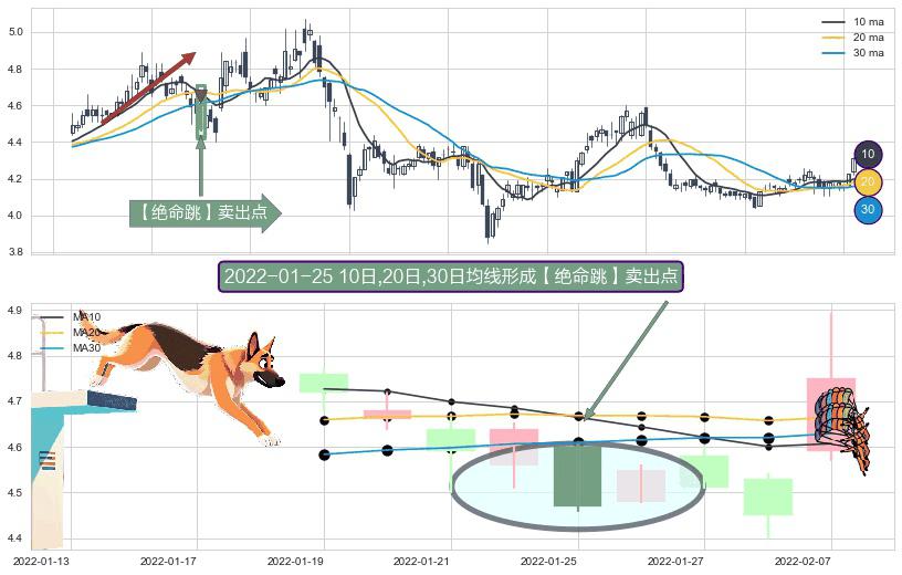 ⚀ 2022-01-25日显现 10日-20日-30日均线 【绝命跳】卖出点 看空信号,后市看跌,卖出