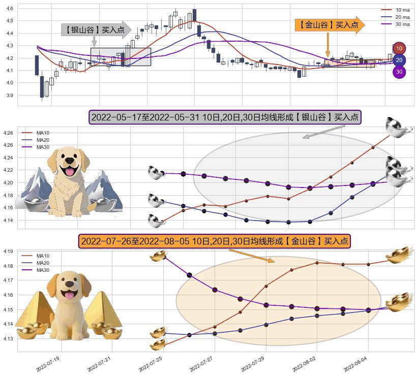 ⚃ 2022-07-27-日至2022-08-05-日显现 10日-20日-30日均线 【金山谷】买入点 其再次确认了买入信号,可靠性更强,买入