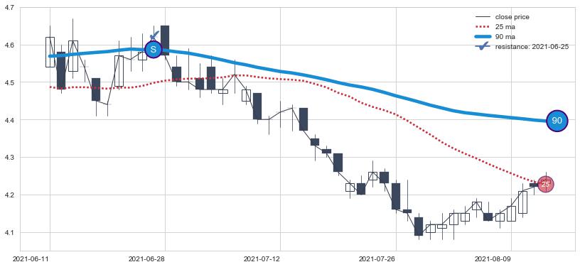 ⚄ 价格在均线遇到阻力后再次向下回落了【极短】距离, 第⑦卖出点 阻力效果【等待验证】