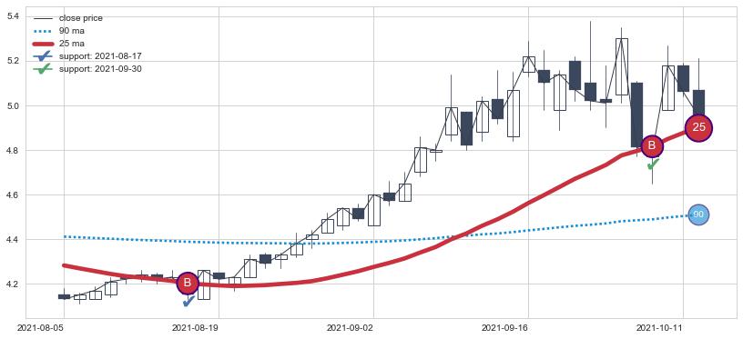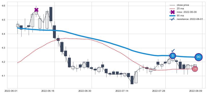 ⚁ MA3和MA8走势平行,且始终保持在短距离内,MA21始终在短中期均线上方,与短中期均线保持一定的距离,微微下行