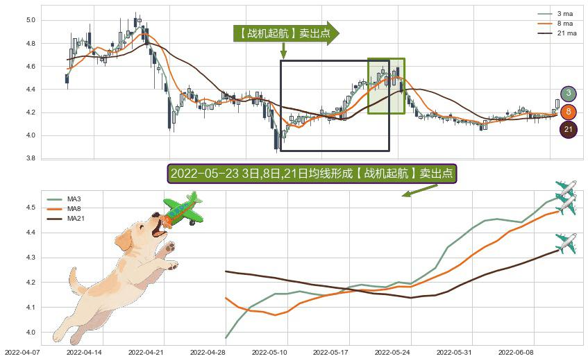 ⚀ 2022-04-28日-2022-06-10日显现 3日-8日-21日均线 【战机起航】卖出点 看空信号,后市看跌,卖出
