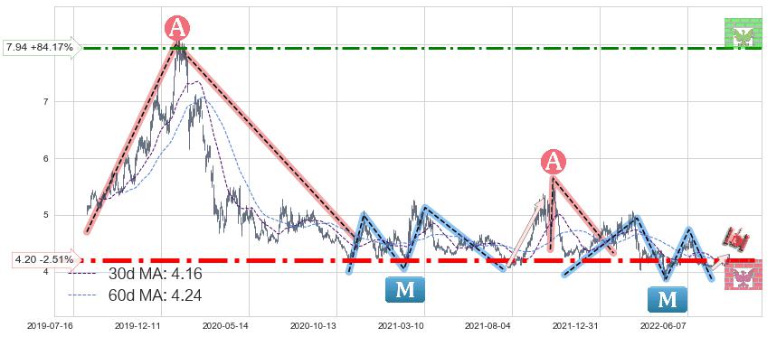 ♘ 阻力价格位7.94,可信任强度56.20%,距离最后交易2022-08-12形成的收盘价格4.31相差 +84.17%