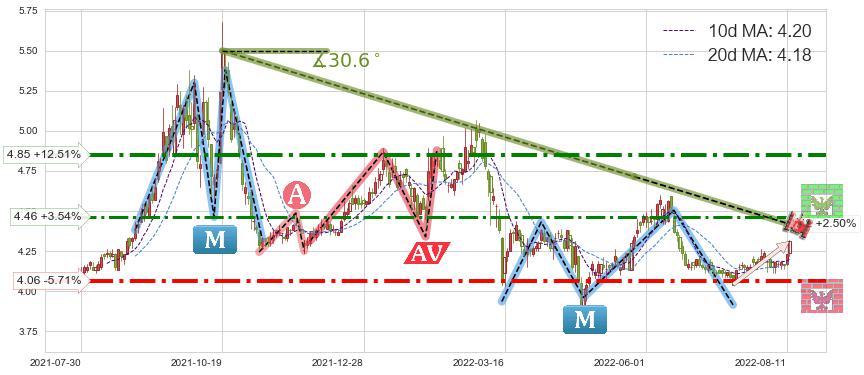 ♘ 阻力价格位4.46,可信任强度68.42%,距离最后交易2022-08-12形成的收盘价格4.31相差 +3.54%