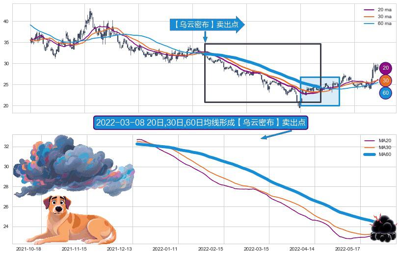 ⚀ 2021-12-15日-2022-05-27日显现 20日-30日-60日均线 【乌云密布】卖出点 看空信号,后市看跌,卖出